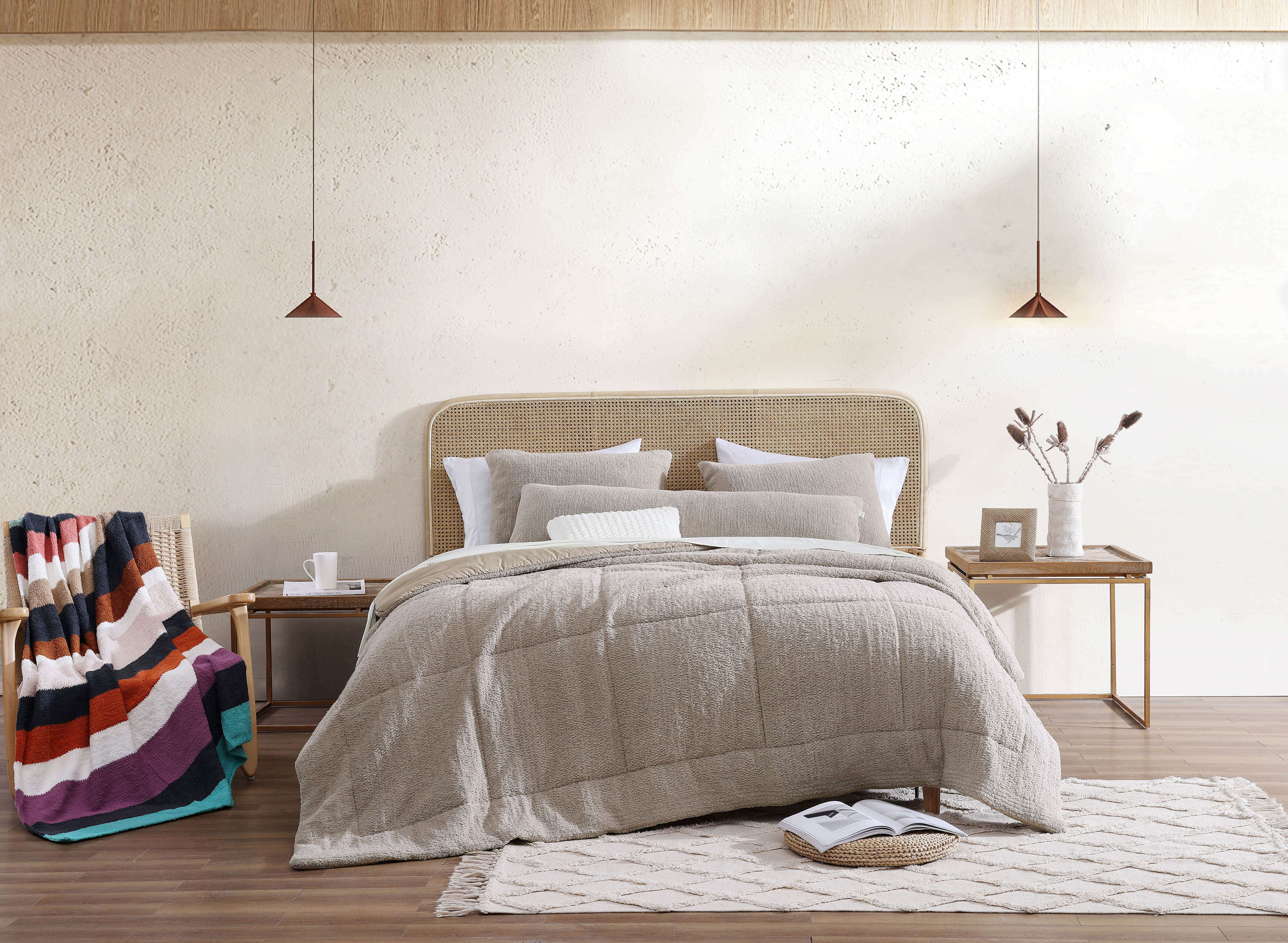 Recreate this classic bedroom look. Go-with-everything neutrals with a quilted twist and pop of color.