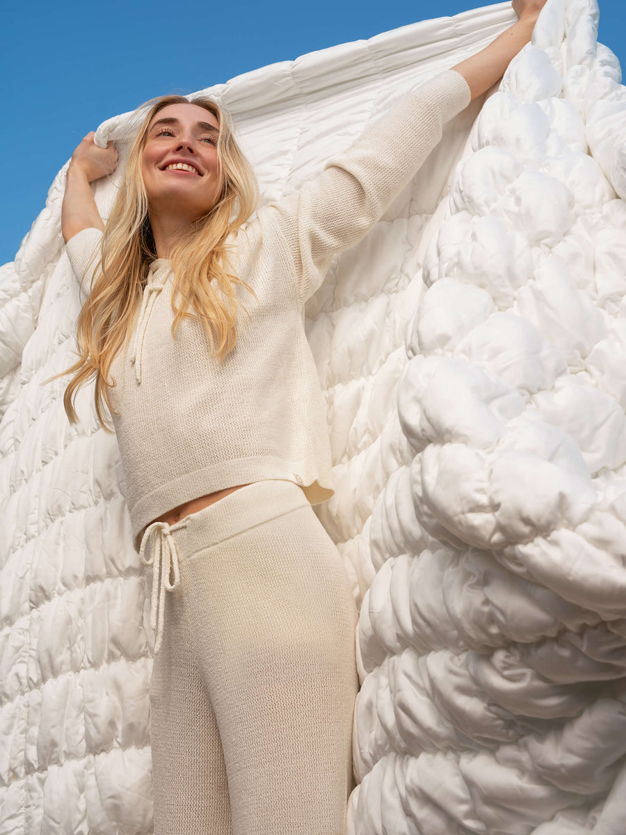 Relaxed, breathable, and effortlessly stylish, these lounge pants are crafted from lightweight CloudCool Light yarn in an open-knit crochet design. With a flowy silhouette and soft feel against the skin, they’re perfect for warm-weather lounging or layering over swimwear. A warm-weather essential with an elevated edge.