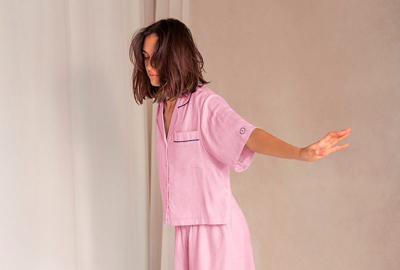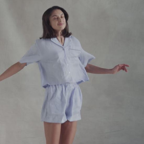 This short pajama set is made for warm nights and slow mornings. It's crafted from breathable, lightweight woven cotton with an exceptionally soft, crisp yet cozy feel. Designed exclusively for indoor wear, it features a relaxed silhouette, contrast piping, and our signature embroidery on its sleeve. It delivers quiet luxury for refined lounging and restful sleep.